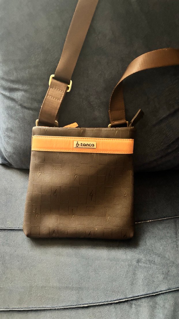 Kahverengi deri, tokalı kayışlı, baskılı desenli kadın çapraz çanta. Gri detaylı, üzerinde '6tanca' etiketi bulunur. Günlük sokak stili için uygun. İkisinin birlikte fiyatı 300 dür