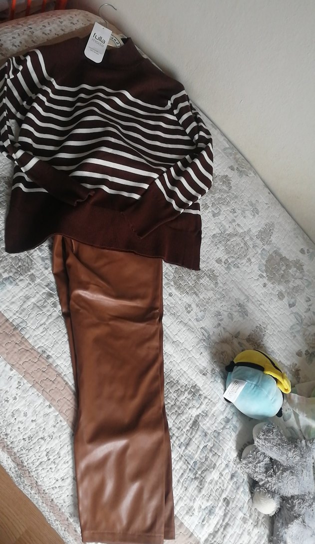 Bol kesim, midi boy, kahverengi deri pantolonu ve takım yapabileceğiniz bluz ikisi de etiketli Bel detaylı, günlük rahat sokak stili için uygun. Pantolon M için uygun 40 yazıyor ama, bluz da ML
