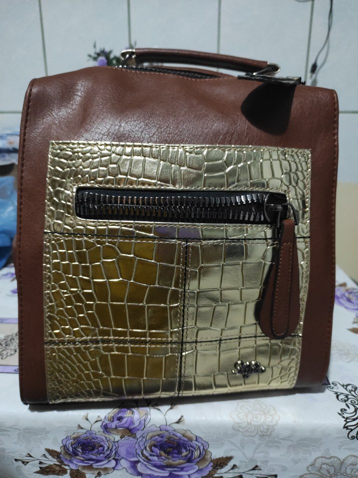 Parlak kahverengi deri ve yılan deseni detaylı, fermuarlı ön cepli çağdaş kadın çantası. Heybeci taba rengi çanta. Hem kol askılı hem sırt askılı, çok şık ve kaliteli bir model. Hiç kullanılmadı, tamamen yeni durumda. Geniş ve kullanışlı. Orijinal fiyatı yüksek olduğu için uygun fiyata veriyorum.