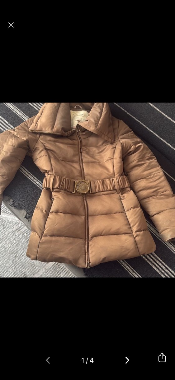 Bej renkli, kemerli ve oturan kesim kadın kışlık mont. Notlu yakası ve askılı kollarıyla günlük rahat ve şık sokak stili için uygundur.
