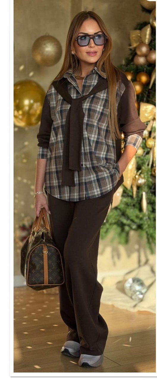 Kahverengi ekose desenli deri gömlek, kesik yakalı ve uzun kolludur. Regular fit ve kemerli detaylarla günlük rahat kullanıma uygundur. *2361 MODAL GÖMLEK ŞAL DETAY TAKIM ️* *Kahve* 2.seri *Hemen teslim* M L