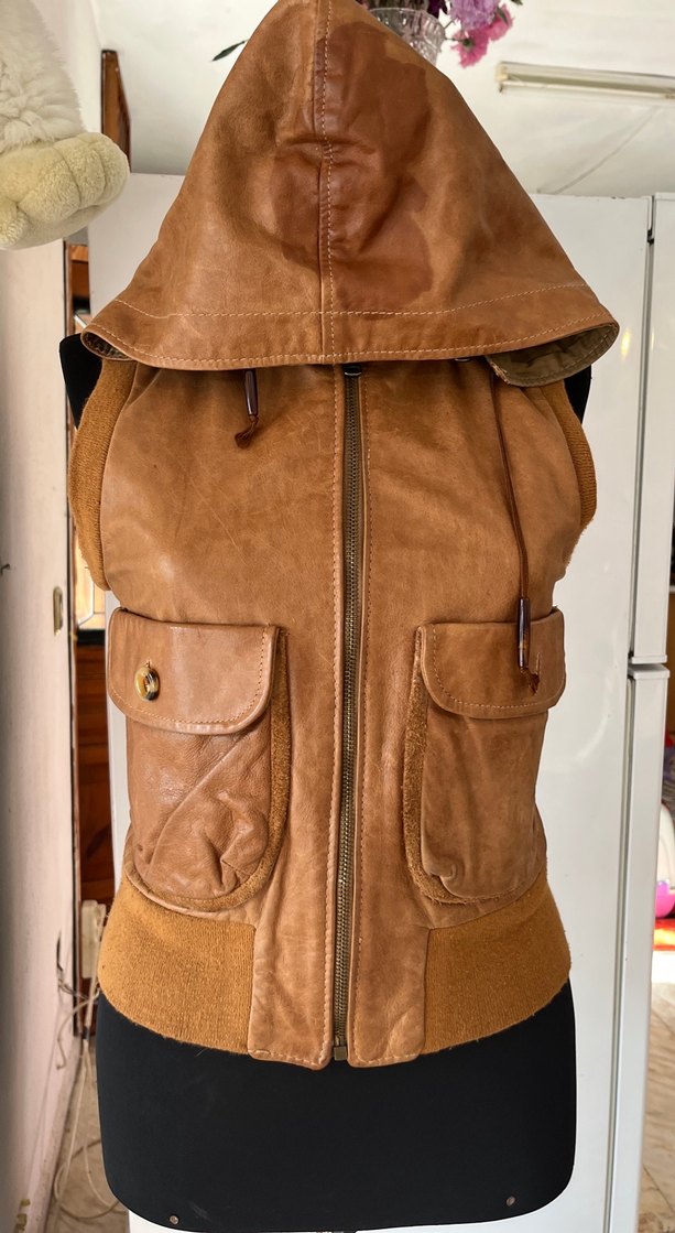Koyu bej renkte, kolsuz deri ceket. Yaka ve kemerli bel detayları, büyük cep ve fermuar kapama ile şık bir sokak stili sunar. Boy 52 en 40