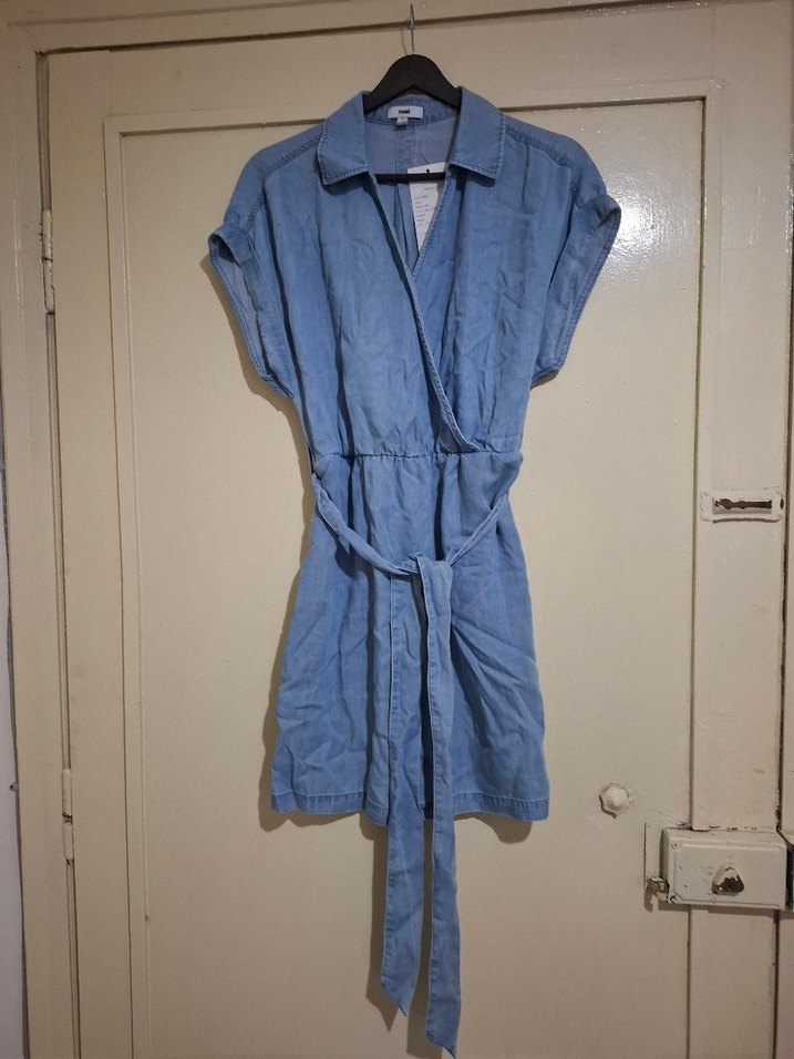 Mavi kot kumaştan, yakalı ve kısa kollu midi boy elbise. Belden kemerli, rahat ve salaş kesim, gündelik kullanıma uygun.90 cm boyunda