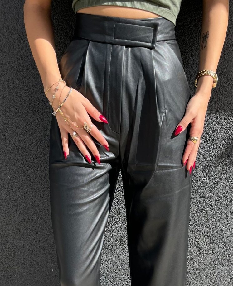 Kemerli, yüksek bel, regular fit ve midi boyda siyah deri cigarette pantolon, günlük sokak tarzı için uygun. 735j