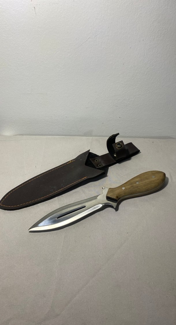 Bej renkli ahşap saplı, keskin paslanmaz çelik bıçağa sahip av bıçağı. Güvenli saklama için koyu renk deri kılıf içerir. Çerkez kaması