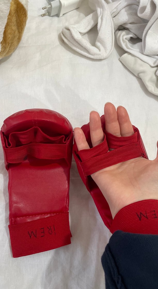 Koyu kırmızı deri boks eldivenleri, kolay ayarlanabilen ve güvenli tutuş sağlayan velcro bantlara sahiptir. Athleisure ve counterculture tarzına uygundur. ufak boya lekesi var silindiginde çıkacak türden