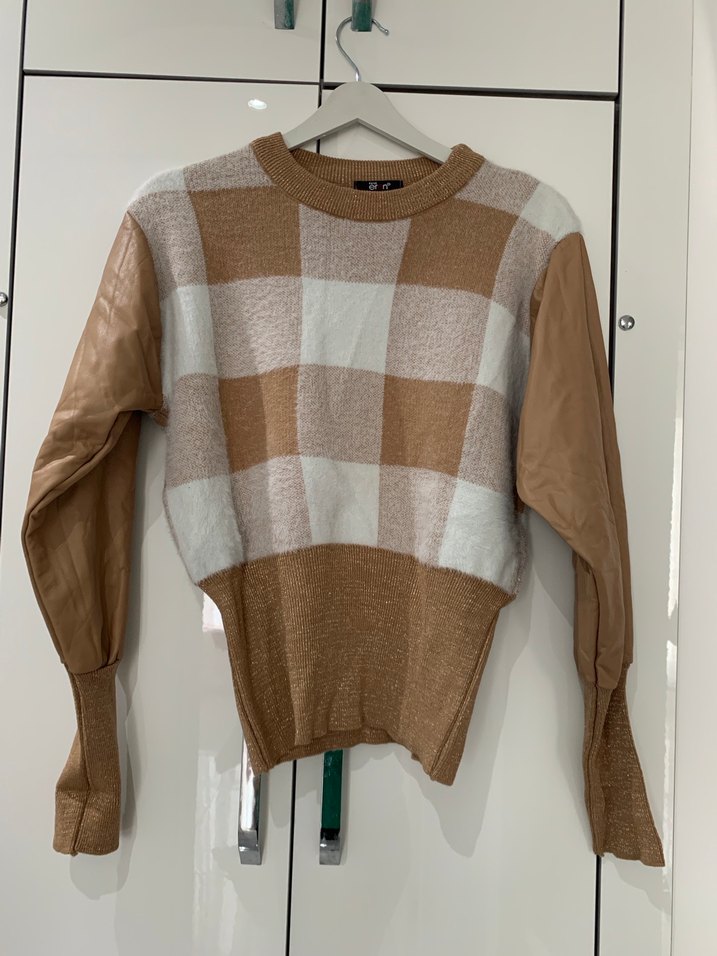 Bej ve gri ekose desenli, deri uzun kollu, yuvarlak yaka kadın trikosudur. Salaş kesimiyle rahat ve şık bir görünüm sunar.