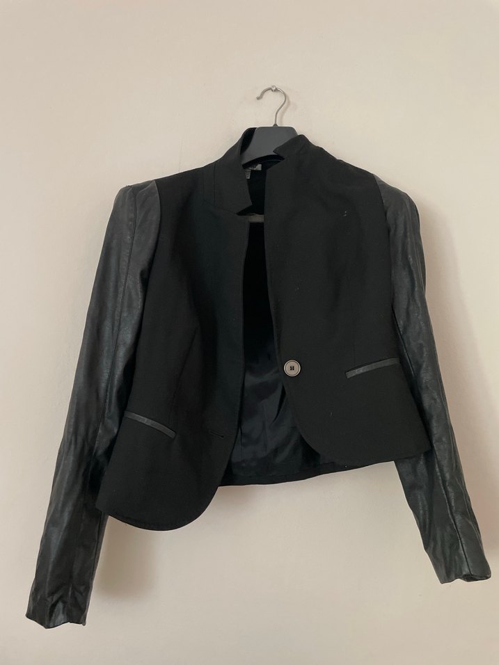 Siyah renkli kadın blazer ceket, deri uzun kollara ve yakalı tasarıma sahiptir. Düğmeli, normal kalıp ve midi boydadır, şık ofis kombinleri için idealdir.