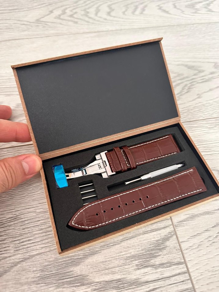 Kahverengi vintage tarzda erkek saat kordonu seti, kolay ayar için aletlerle birlikte. Klasik iş görünümü için tasarlandı. Kutusu ahşaptan yapışmıştır