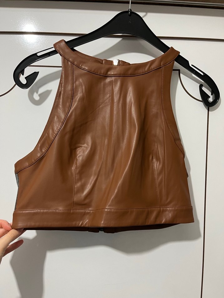 Kahverengi deri, kemerli ve kolsuz, kısa boy, yüksek yakalı, dar kesim bir üst. Günlük sokak stili için uygun. Hiç giymedim sıfır kalıp dar esnemez s-M bedene uyar