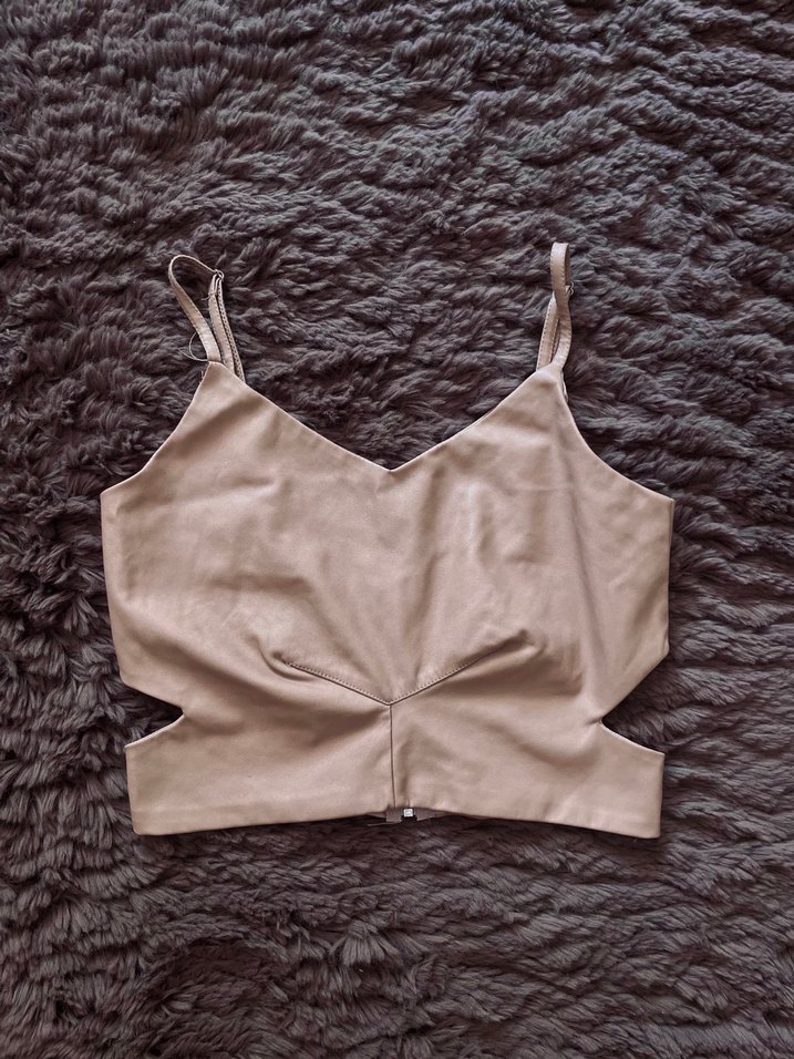 Deri kumaştan yapılmış, ip ayarlanabilir askılı ve fitted kesimli, kenarları pencereli bej mini büstiyer. Dışı yumuşacık deri içinde pamuklu astarı var. Rahat ve şık bir tarza sahip Ürünü üstüme olduğu zamanlar giyerim diye düşünüp rahatsız ettiği için etiketi kesmiştim. Fakat dolabımda unutuldu ve artık üstüme de olmuyor. Şimdiden güle güle kullanın ♥️