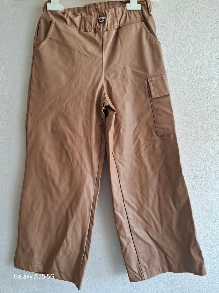 Bej renkli, deri kumaştan yapılmış, bol kesim ve midi boy kadın pantolon. Kemer detaylı ve yan cepli, sokak stiline uygun. ✨