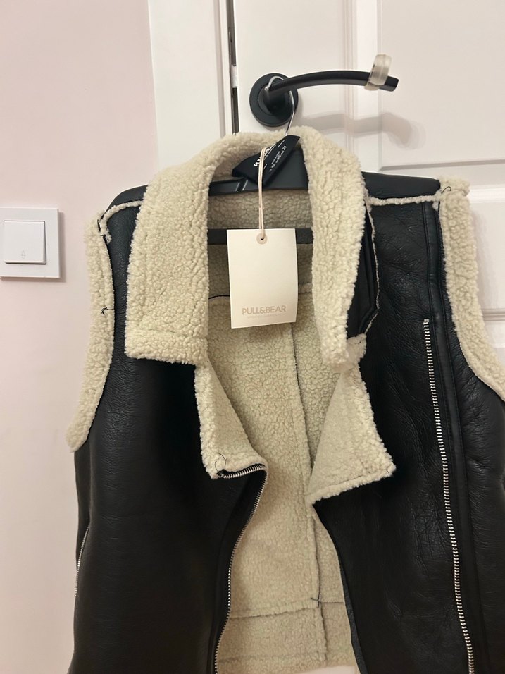 Kürklü detaylı, notched lapel yakalı, deri kadın yelek. Siyah renkte, midi boyda ve rahat kesimlidir. Sokak modasına uygun şık bir parça.