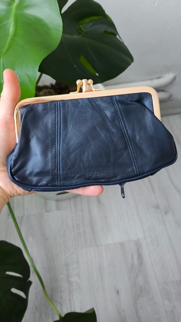 Deri lacivert vintage kadın cüzdan, fermuarlı bölme ve klasik çerçeve kapanışıyla günlük kullanım için uygundur.