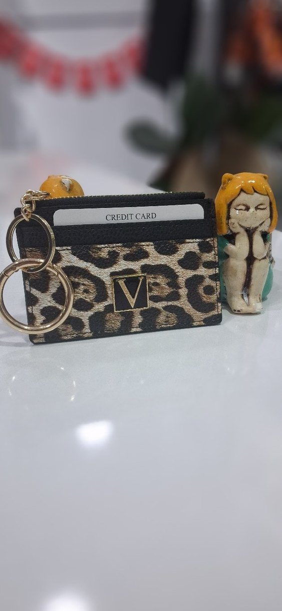 Kahverengi deri kadın cüzdan, leopar desenli baskıya ve fermuarlı bölmeye sahiptir. Kartlık ve anahtarlık içerir, trend sokak stili için uygun.