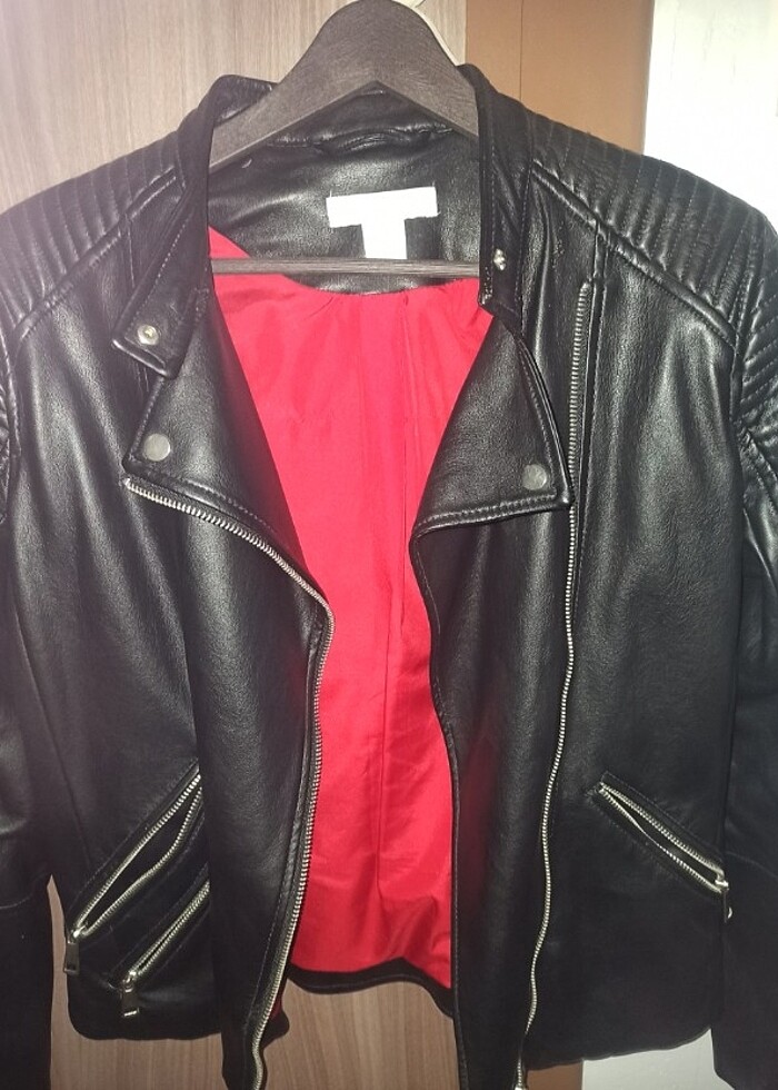 Hiç bir sorunu yoktur içi kırmızı dışı siyah kısa deri ceket