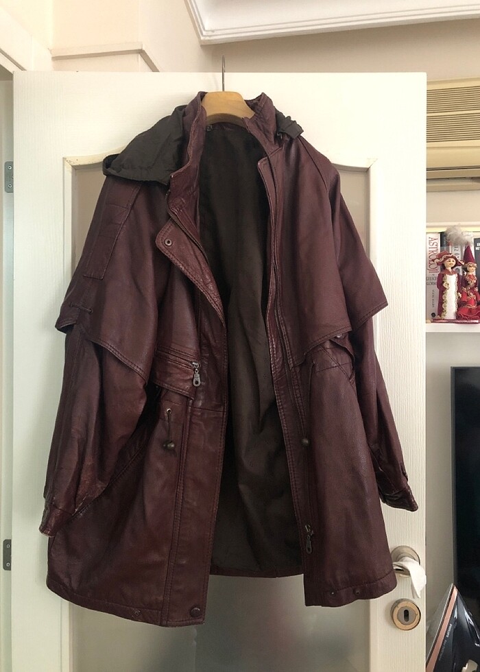 Yüzde yüz deri mont. Bazı kısımlarda deforme var.Boyanırsa düzelir. Beden 54 Kol uzunluk 65cm Uzunluk 90cm
