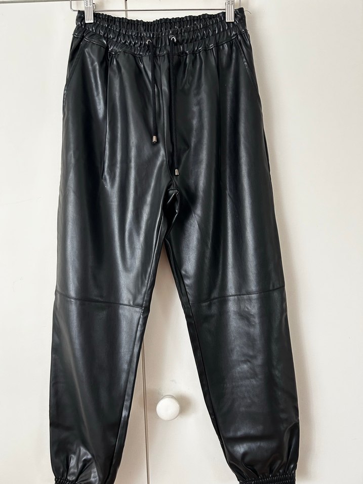 Siyah deri, salaş kesim pantolon. Jogger paça bilek detayları ile rahat bir sokak stili sunar. Hiçbir kusuru yoktur. Tertemiz