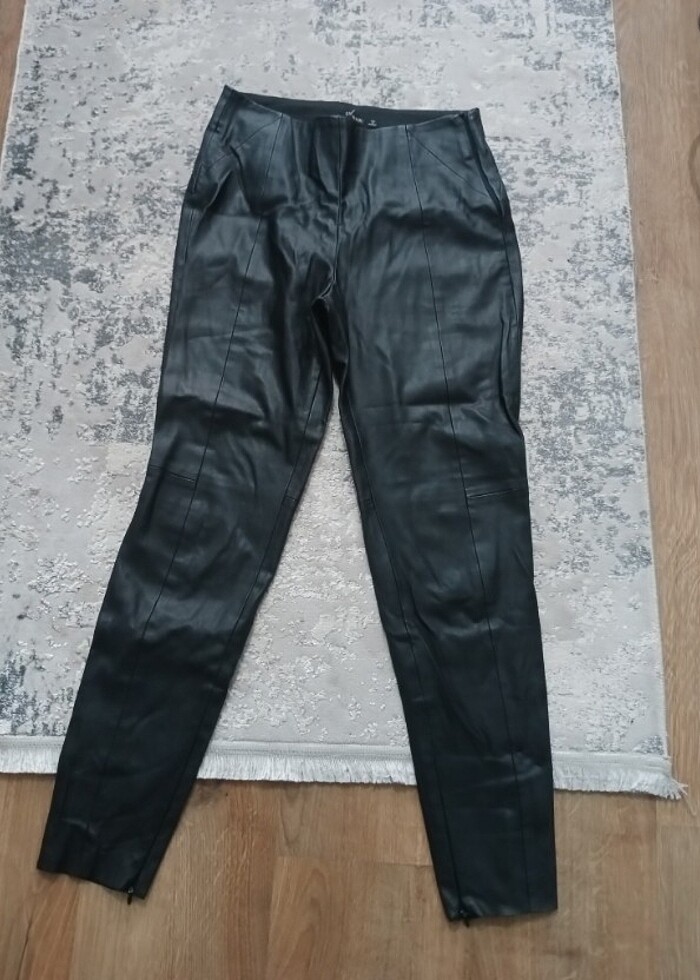 Deri pantolon iyi durumda sadecee biraz kırışmış beli lastikli ve fermuarlı ayak uclarindada fermuar bulunmakta