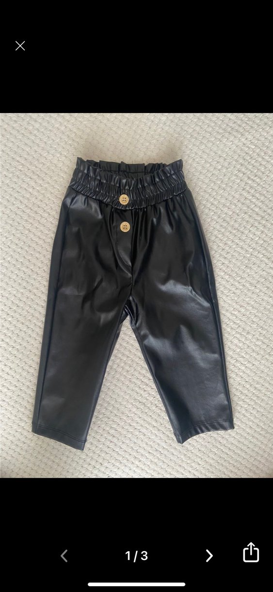 Düğmeli, bol kesim siyah deri pantolon, midi boy ve büzgülü bele sahip. Paris sokak stilini yansıtan şık ve rahat bir model. bir kez kullandik yeni ici polar degil