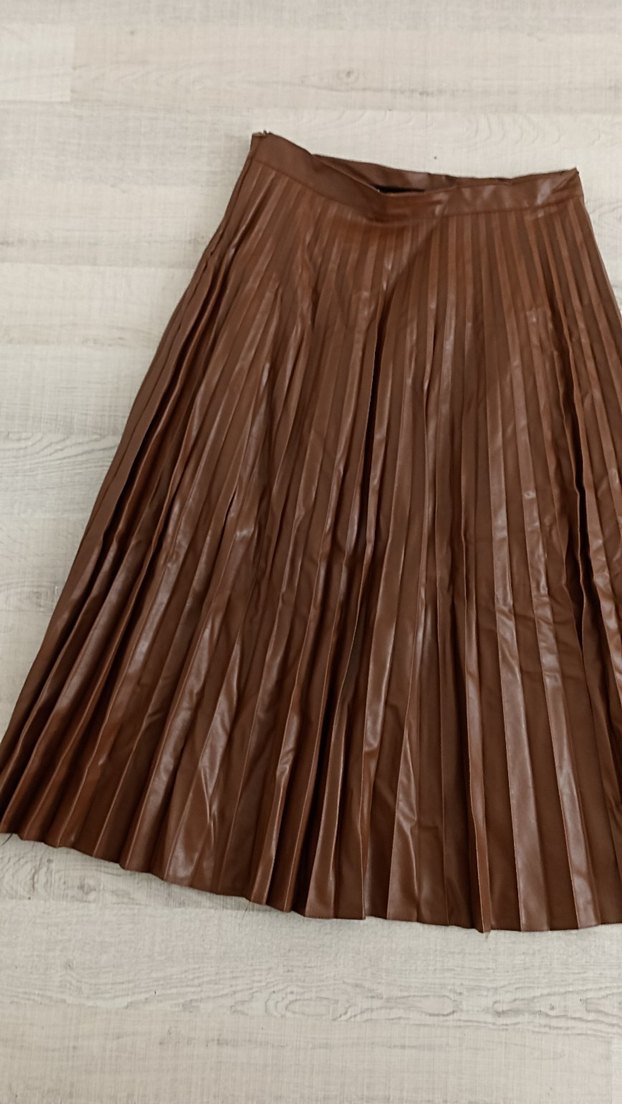 Bu dar kesim uzun etek, parlak kahverengi deri ve pilili detaylara sahiptir. Paris sokak modası ile bohem tarzı harmanlar. Günlük kullanım için uygundur.