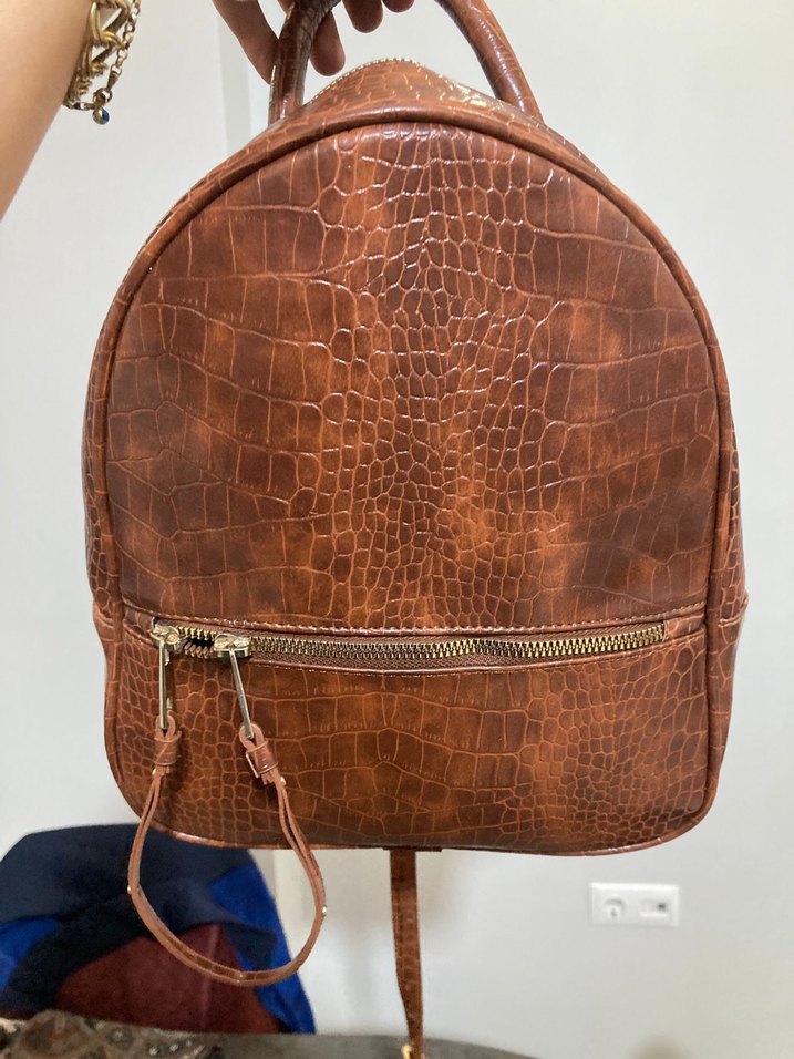 Parlak yılan desenli kahverengi deri sırt çantası, fermuarlı ve sokak modasına uygun.