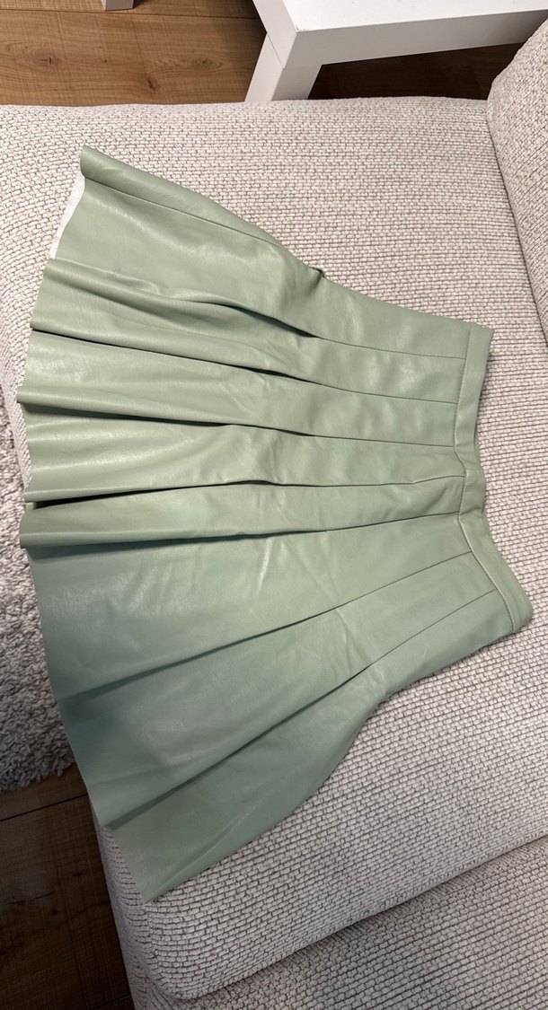 Pilili detaylara sahip pastel yeşil deriden yapılmış midi etek, çağdaş ve şık bir görünüm sunar.