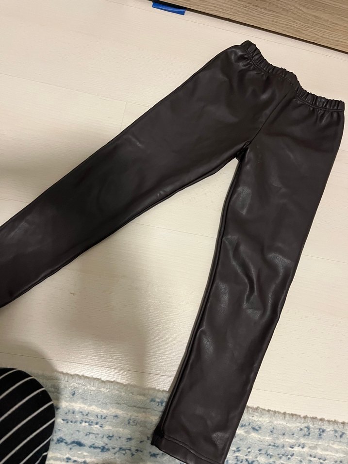 Kahverengi deri, pilili ve baskılı detaylara sahip, Paris sokak modasından esinlenmiş, günlük kullanıma uygun midi uzunlukta, dar kesim kadın pantolonu.