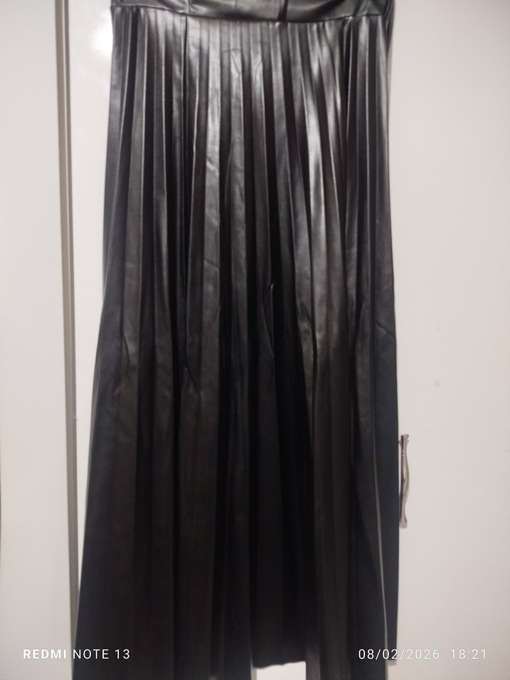 Bu deri pilili uzun siyah etek, ofis için uygun, dikkat çekici gotik tarzda ve vücuda oturan kesime sahiptir.