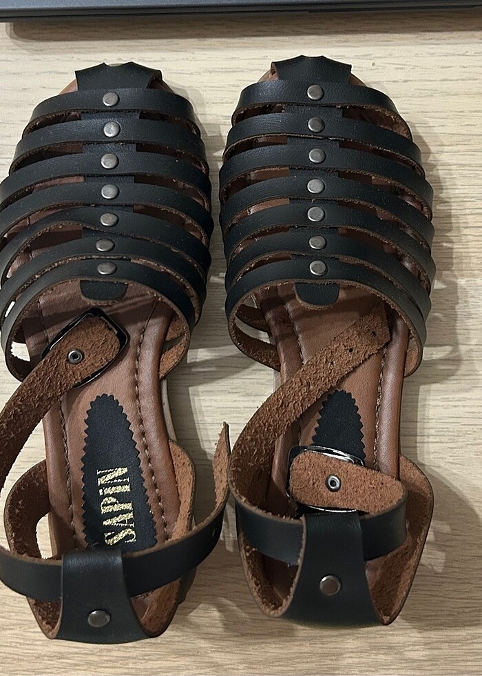 Siyah renk, 36 numara, hakiki deri, kadın sandalet. Ürün hiç kullanılmamıştır.