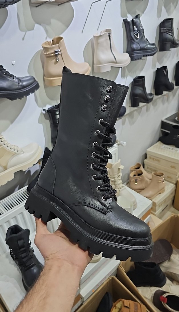 Siyah deri, bağcıklı ve platform topuklu botlar. Gotik sokak stiline uygun, günlük kullanıma uygun trendy casual tasarım.