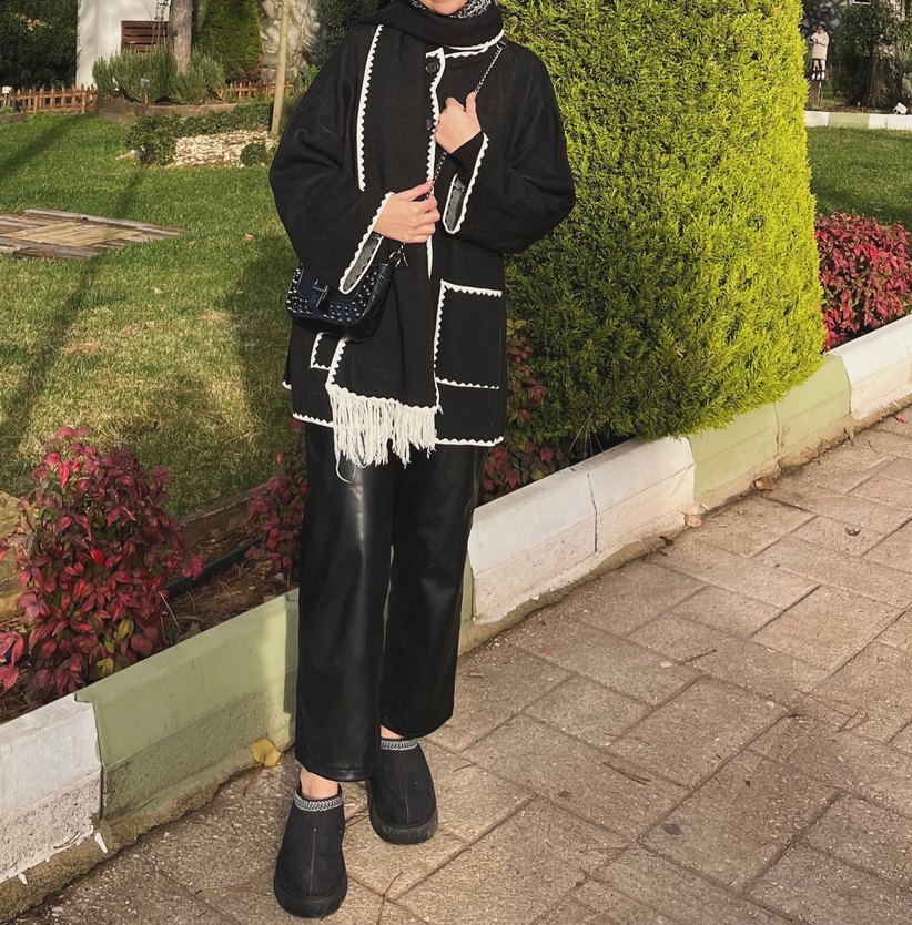 Siyah deri, bel detaylı, dar kesim midi pantolon. Sokak stili için uygun, günlük kullanımda rahat ve şık görünüm sağlar.