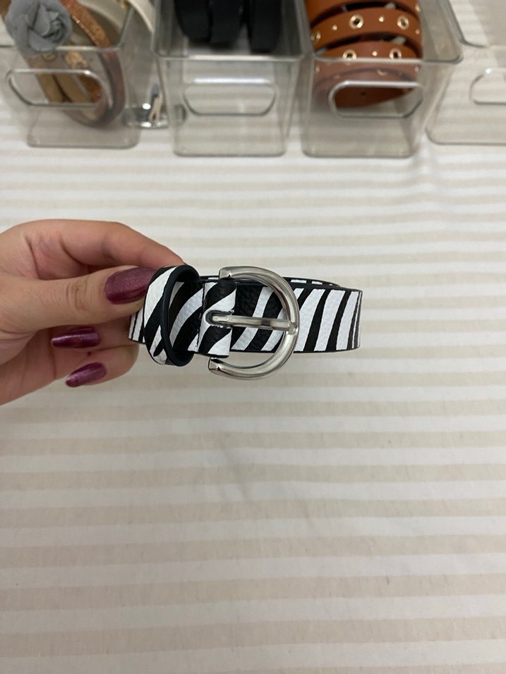 Deri Siyah Beyaz Çizgili Kadın Kemer