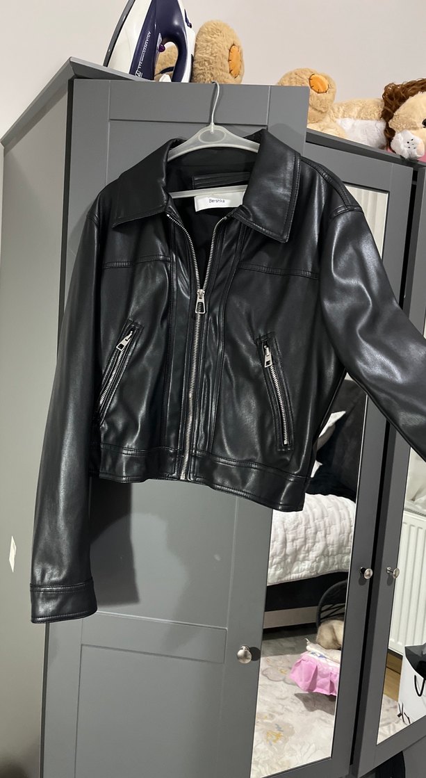Siyah deri biker ceket, fitted kesim ve yakalı. Fermuarlı cepler ve uzun kollara sahip, günlük kullanıma uygun.