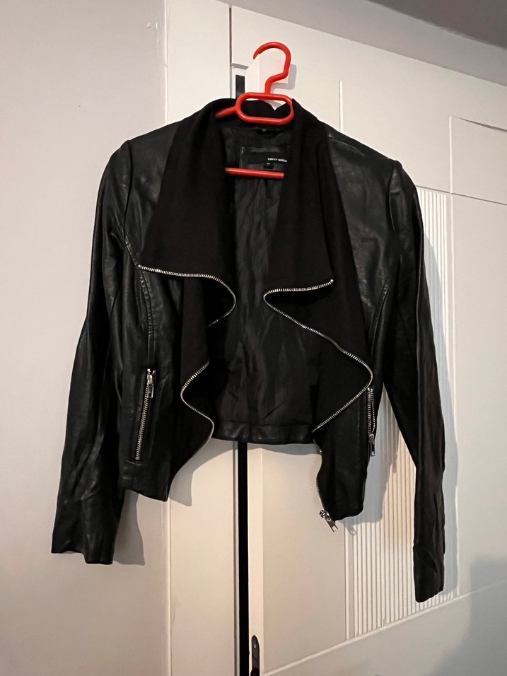 Siyah deri biker ceket, keskin yakalı ve fermuarlı detaylara sahiptir. Uzun kollu ve midi boydadır, sokak stiline uygundur.Ürün çok az kullanılmıştır soyulma vs yoktur