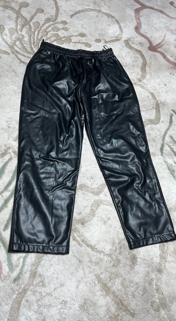 Siyah deri, bol kesim, kemerli kadın pantolon. Midi boyda, sokak stili için uygun, günlük kullanıma ideal.