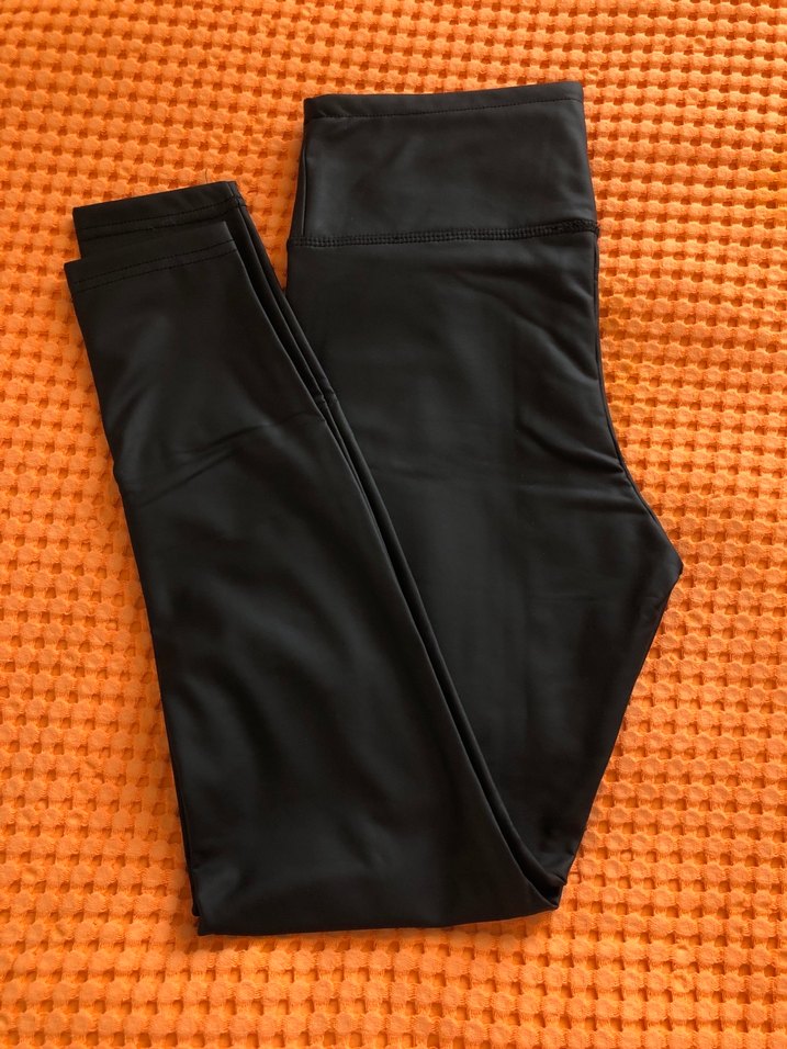 Siyah deri, dar kesim ve midi boy tayt elastik bel bantlı, spor ve sokak stilini birleştirir.