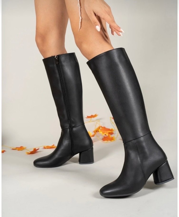 Siyah deri, topuklu kadın çizmesi, minimalist ve çağdaş stil ile günlük kullanıma uygundur.