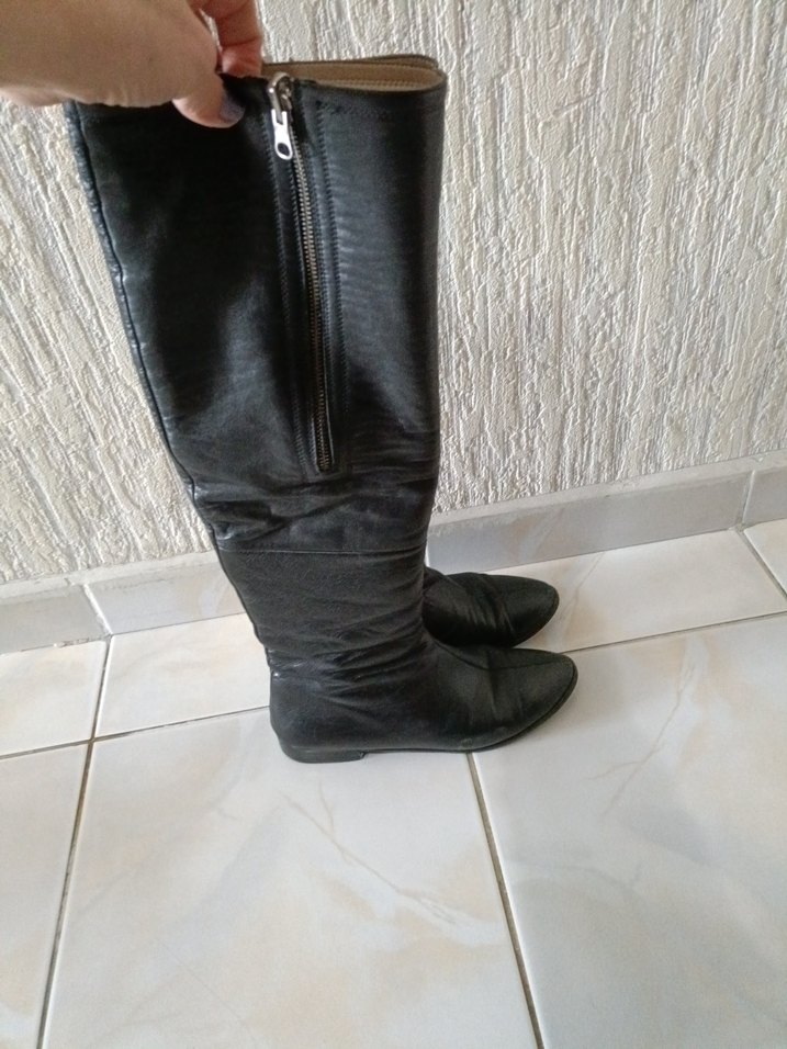 Deri Siyah Dizüstü Topuklu Çizme