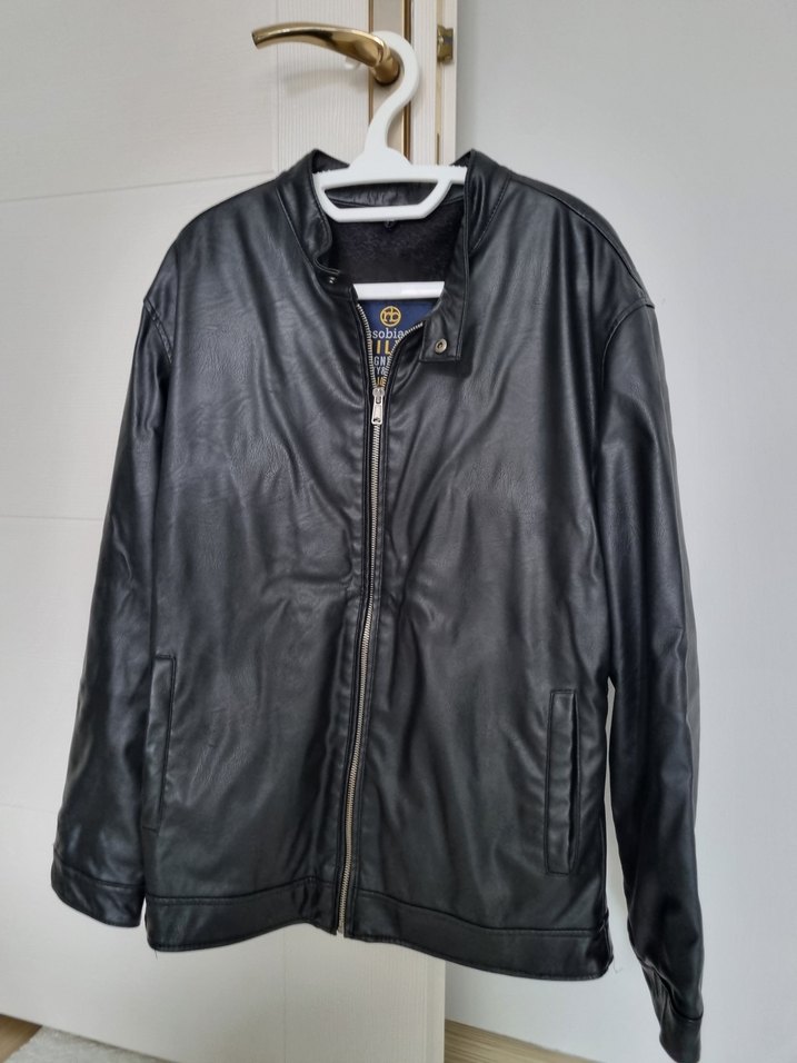 Siyah deri erkek biker ceket, uzun kollu ve fermuarlı. Notlu yaka ve normal kesime sahip, günlük kullanıma uygun.