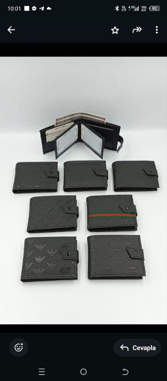 Baskılı desenli, çıtçıtlı kapaklı siyah erkek deri cüzdan seti. Kart ve nakit için çoklu bölmelere sahiptir.
