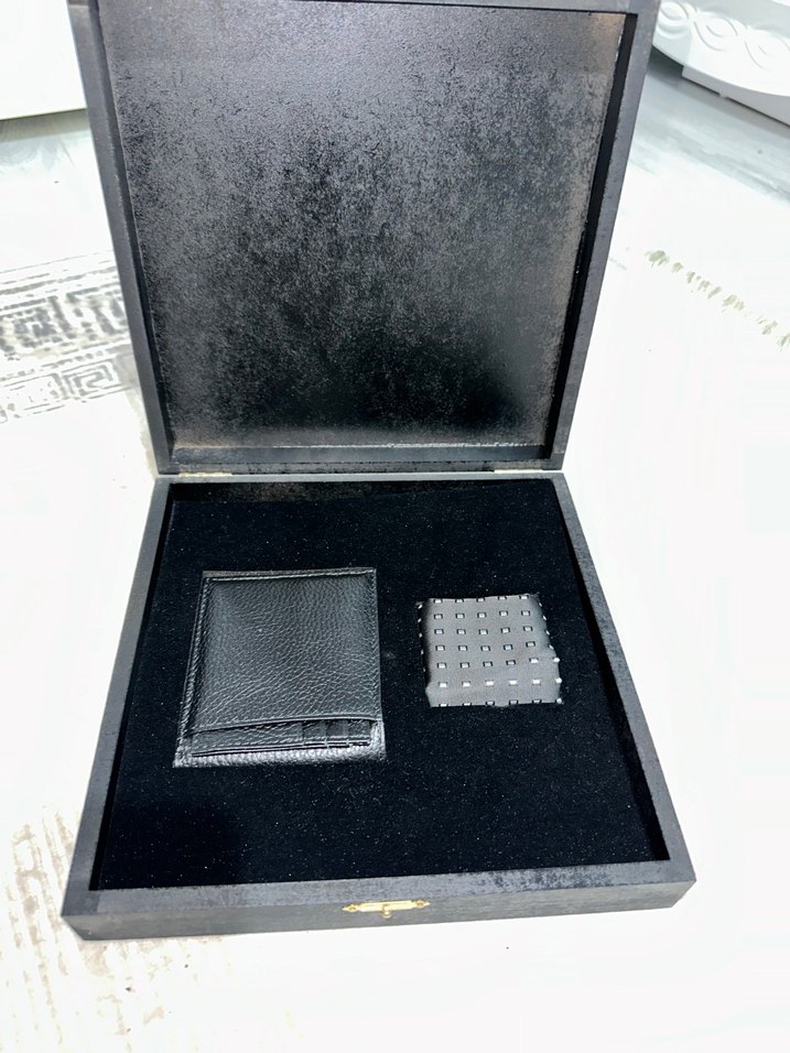 Dokulu deri siyah erkek cüzdan ve kartlık seti, siyah kadife kaplı kutuda sunulur. İş ve avangart tarzlar için minimalist tasarım.