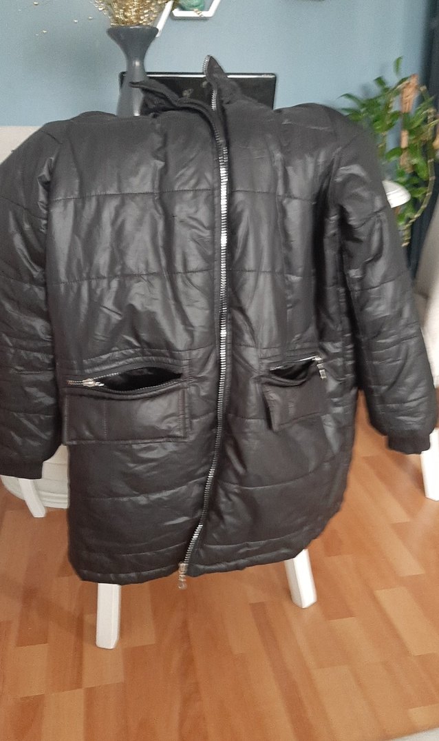 Fermuarlı cepleri ve kesimli yakasıyla siyah deri, uzun kollu, kadın mont.36 beden ama m bedenede olur markasiAsist alan memnun kalir