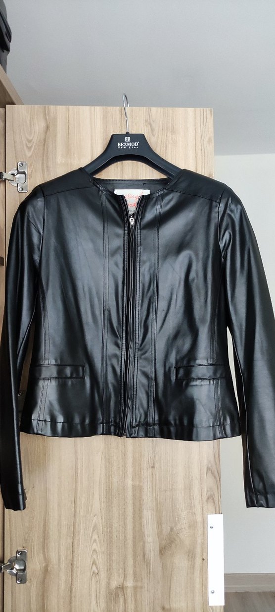 Bu siyah deri biker ceket, fermuarlı ön ve uzun kolludur. Notlu yaka ve parlak görünüme sahiptir, rahat kullanım için uygundur. 40 beden