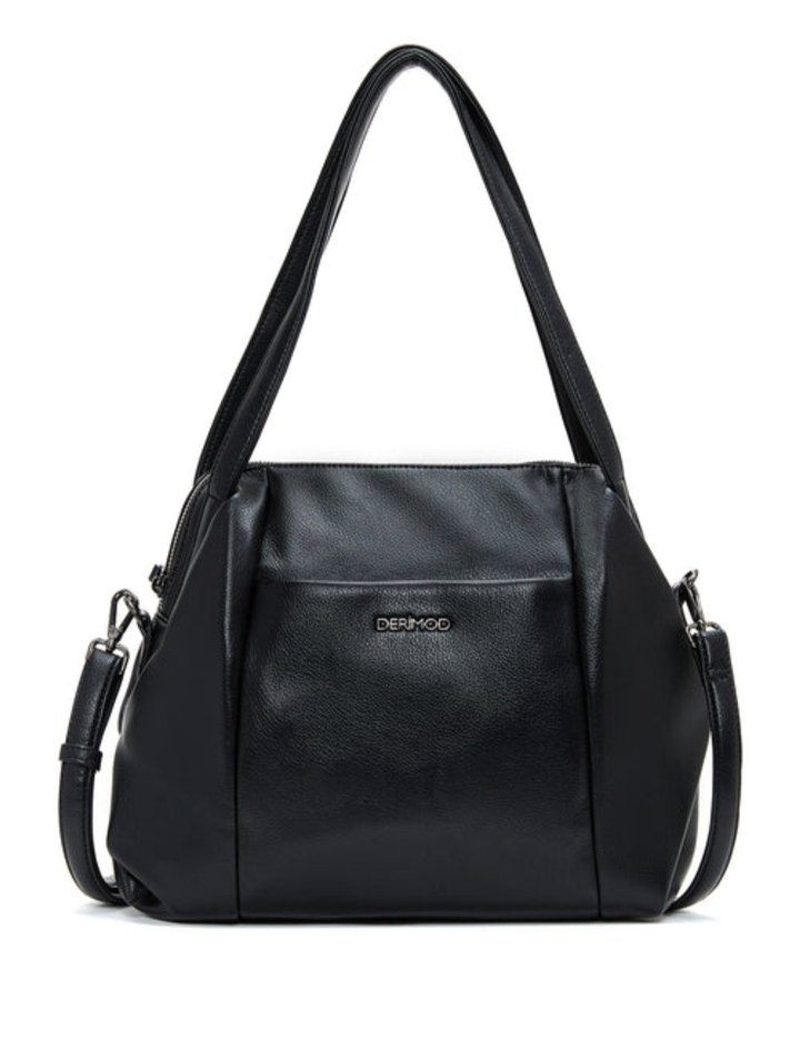Siyah deri, kemerli, modern klasik tarzda minimalist ve desen içermeyen kadın çantası. Günlük kullanıma uygundur.