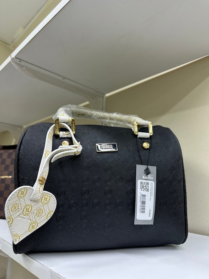 Siyah deri kadın çanta, baskılı desene ve parlak yüzeye sahiptir. Metal tokalı sapları ve kalp şeklinde etiketi bulunur. Günlük kullanım için modern klasik tarzda.