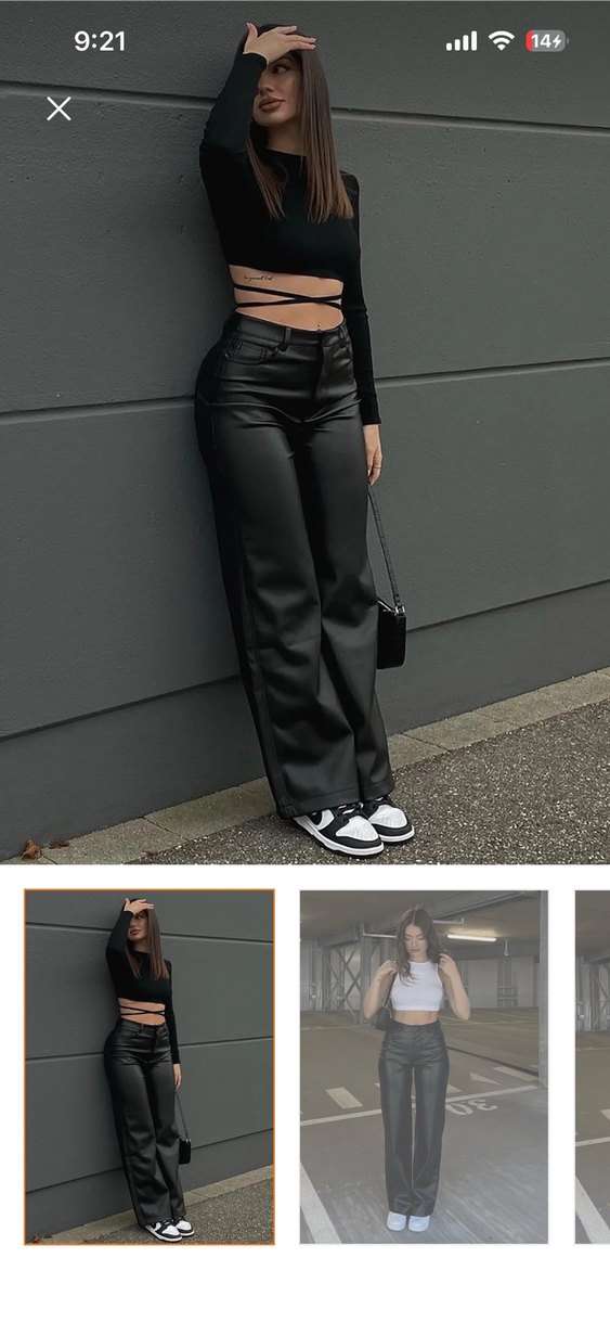 Siyah deri düz paça pantolonlar, kemerli ve normal kesim olup günlük sokak stili için uygundur. Midi boy ve desensizdir.