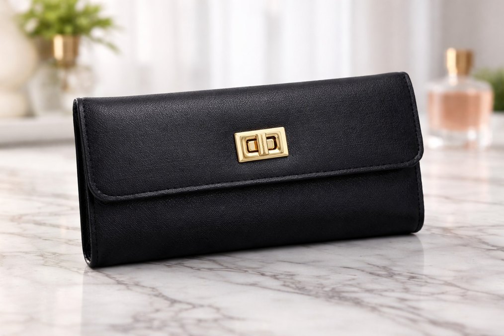 Siyah deri tokalı kadın cüzdan, iş ortamına uygun modern klasik tarzda nakış detaylarıyla şık bir görünüm sunar.