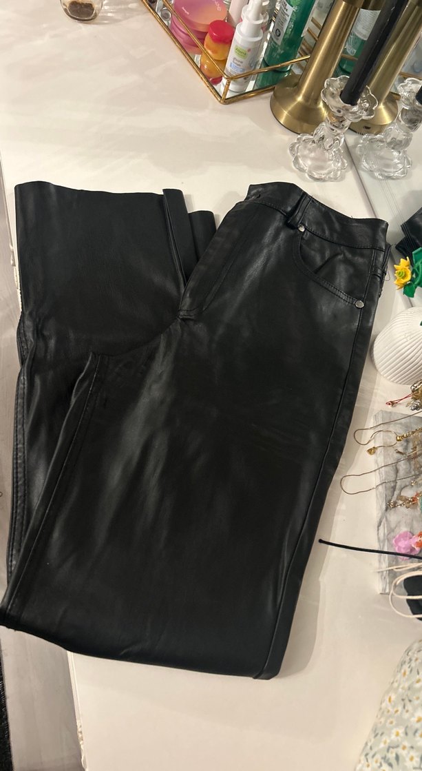 Siyah deri kadın pantolon, midi boy ve kemerli. Düz yüzeyli, regular fit, sokak stiline uygun rahat bir modeldir.
