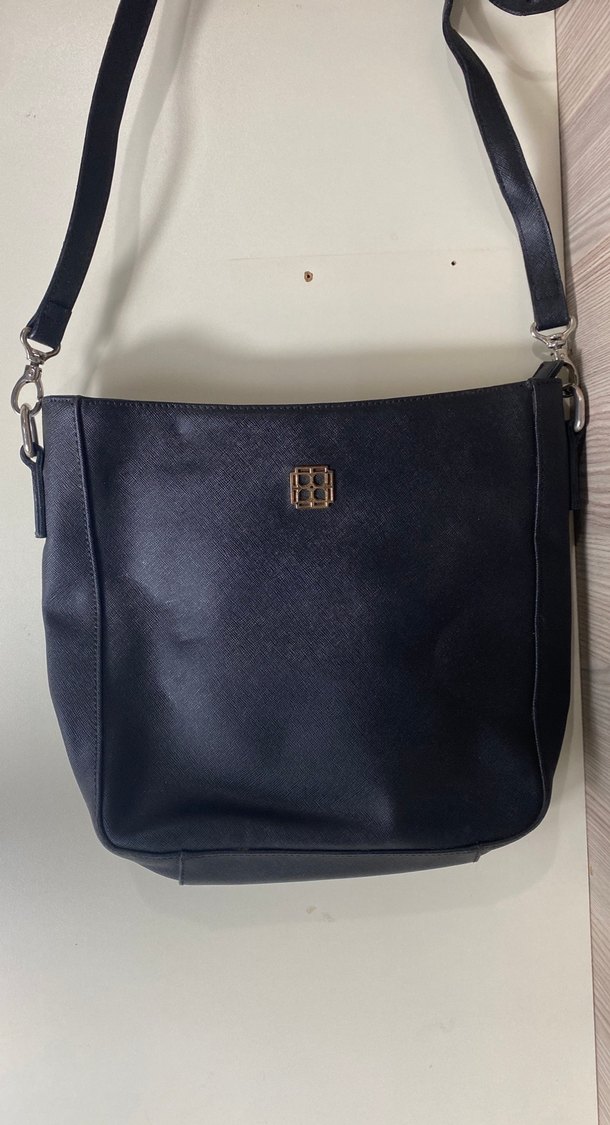 Siyah deri kadın omuz çantası, tokalı askısı ve baskılı detayıyla günlük kullanım ve sokak stiline uygun.